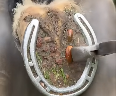 This Video captures a critical moment in professional equine hoof maintenance, where precision, skill, and anatomical knowledge come together to protect the health and performance of a horse. The underside of the hoof is clearly visible, supported securely between the handler’s legs, while a specialized hoof knife carefully removes compacted debris, dead sole, and excess material from within the horseshoe. Proper hoof trimming and cleaning are essential components of responsible horse care, as the hoof functions as the foundation of the entire musculoskeletal system. When dirt, stones, moisture, and organic matter accumulate inside the hoof, they can create an environment conducive to bacterial or fungal infections, bruising, imbalance, and long-term structural problems. In this process, the farrier methodically inspects the frog, sole, and hoof wall, ensuring that pressure is evenly distributed and that the natural shape of the hoof is preserved. The horseshoe provides additional support and protection, particularly for working or athletic horses, but it also requires routine maintenance to prevent trapped debris from compromising hoof integrity. Skilled trimming not only enhances comfort but also improves gait symmetry, shock absorption, and overall stability. Every careful cut reflects experience and an understanding of equine biomechanics, as over-trimming or uneven shaping can lead to lameness or joint strain. This image represents more than simple cleaning—it highlights preventative healthcare, attention to detail, and a commitment to animal welfare. Consistent professional hoof care ensures that the horse remains sound, balanced, and capable of performing at its highest potential, whether in sport, work, or leisure riding.